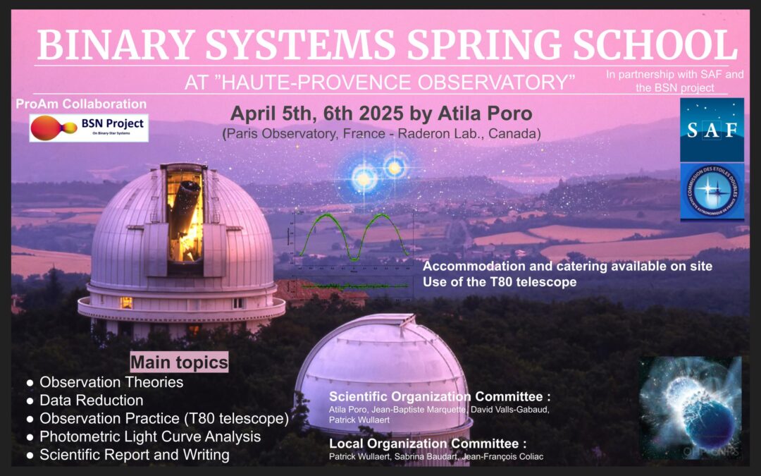 La « Binary Systems Spring School » (B3S) L’initiative de cette école revient au Projet BSN (Binary Systems of South and North), qui s’est associé pour ce faire à la Commission des étoiles doubles de la SAF. Le Projet BSN associe des astronomes professionnels et...